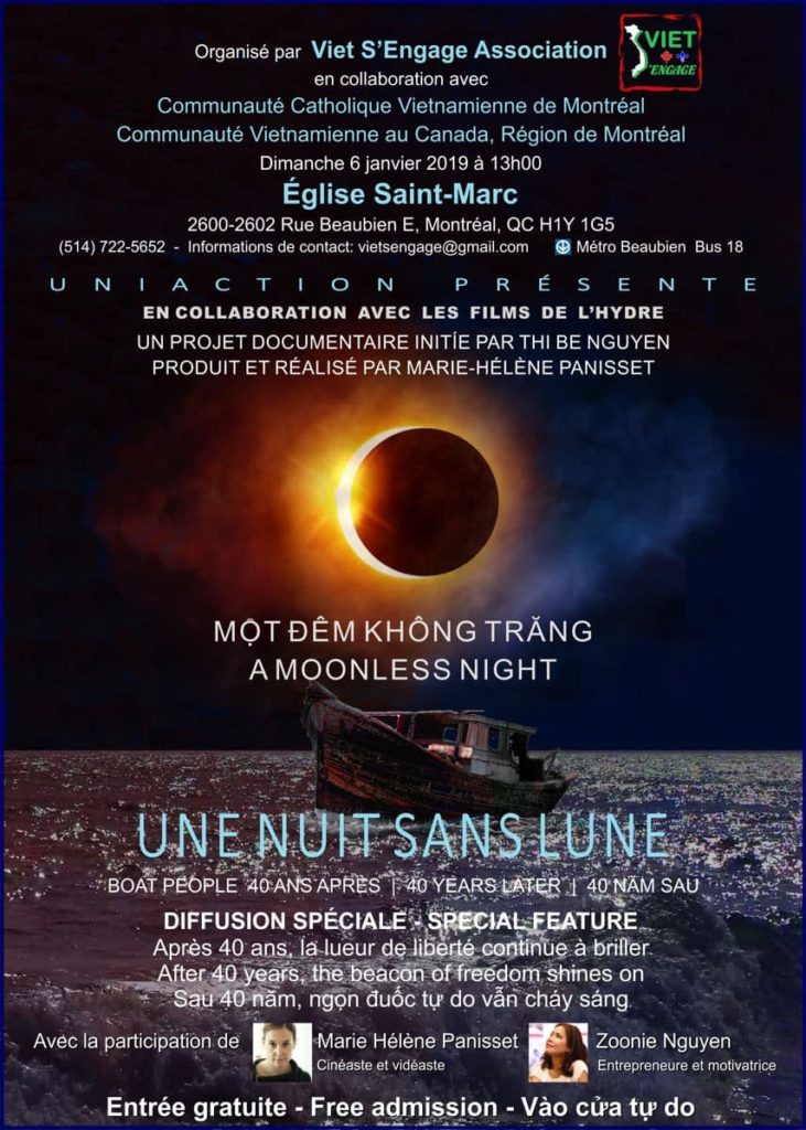 Kính mời quý vị tham dự buổi chiếu phim UNE NUIT SANS LUNE (Một Đêm Không Trăng: Thuyền Nhân 40 Năm Sau) vào lúc 1 giờ trưa ngày Chủ Nhật, 06-01-2019 tại Église Saint-Marc 2600 Rue Beaubien Est Montréal, QC H1Y 1G5.